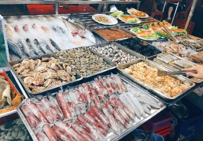 Điểm nhấn của Chợ đêm Phú Quốc chính là thiên đường hải sản. Tất cả đều tươi sống, đánh bắt trong ngày. Các quầy hàng trưng bày hải sản trên băng lạnh. Cá, tôm, ghẹ, ốc, mực đủ loại có sẵn.