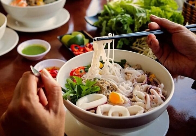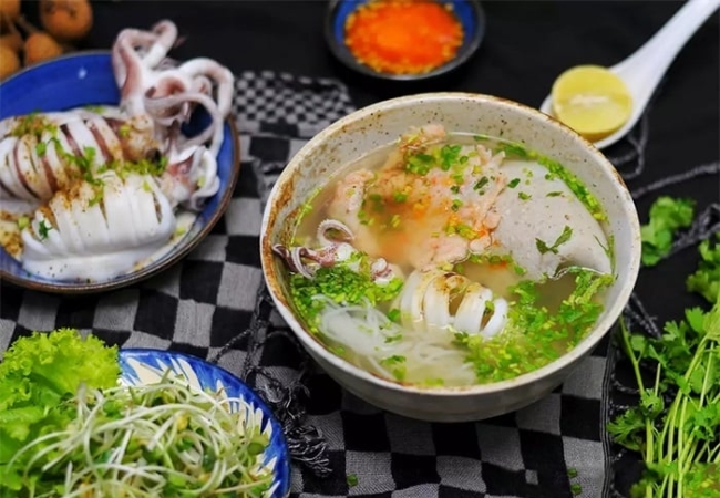 Món ăn sáng phổ biến trên đảo Ngọc. Sợi hủ tiếu dai, mực ngọt giòn, nước lèo đậm đà. Rau ăn kèm thanh mát tạo sự cân bằng. Một tô hủ tiếu mực là khởi đầu tuyệt vời cho ngày mới.