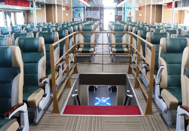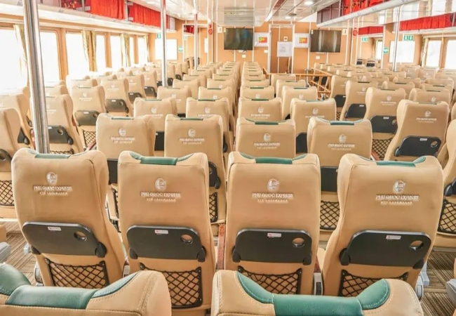 Một trong những yếu tố giúp Phú Quốc Express ghi điểm trong lòng du khách chính là nội thất hiện đại và cao cấp. Không gian bên trong tàu được thiết kế theo phong cách châu Âu, tối ưu hóa diện tích để hành khách luôn cảm thấy dễ chịu nhất. Ghế ngồi được bọc vật liệu êm ái, có độ ngả phù hợp cho những hành trình dài trên biển.
