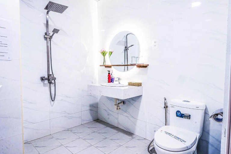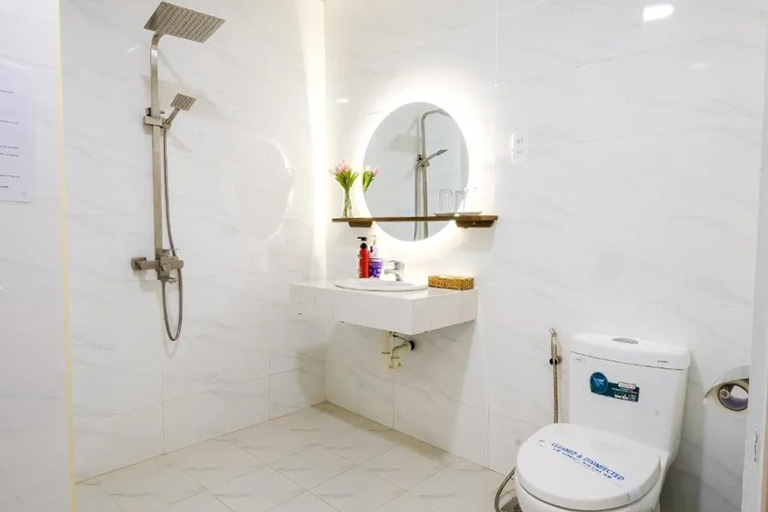Phòng tắm riêng có sẵn đồ vệ sinh cá nhân miễn phí, máy sấy tóc và vòi xịt/chậu rửa vệ sinh, đảm bảo sự riêng tư và thuận tiện. Đặc biệt, chúng tôi cung cấp đầy đủ khăn tắm và ga trải giường cao cấp để quý khách có một giấc ngủ ngon trọn vẹn.