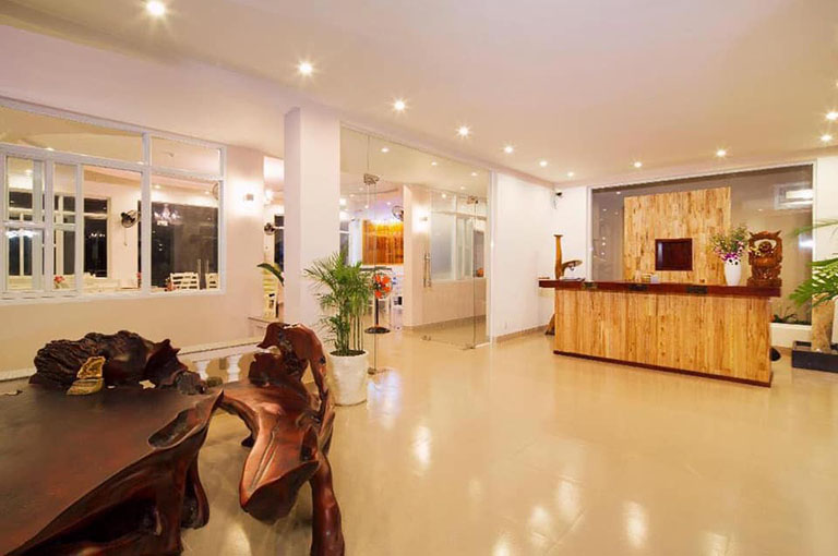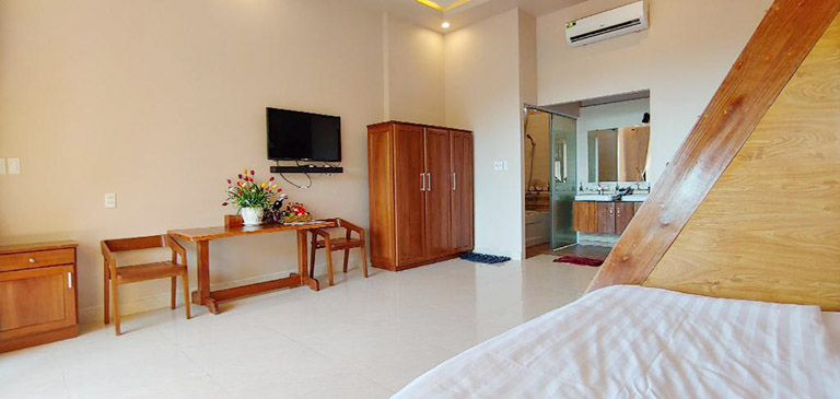 Phòng mình là VIP03 view hồ bơi và biển Về view: sáng sớm và chiều nhìn ngắm mặt trời rất đẹp nhưng nhìn hơi chếch xuống dưới sẽ thấy khu mộ Vị trí: + Phòng mình ở trên đồi = đi cầu thang phê luôn + Khách sạn nằm sâu trong hẻm, đi vô sâu tít luôn + Trước kháchsạn có tiệm tạp hóa nhỏ có thể mua mì ly, bàn chải, kem đánh răng … và có tiệm giặt đồ. Bạn có thể mua đồ cá nhân thiếu ở đây hoặc vô kháchsạn mua. kháchsạn cũng có bán và giá chấp nhận được Tiện ích phòng: + Có máy sấy, tủ lạnh, trà và cafe miễn phí. Mỗi ngày được 2 chai nước free Giá và phí: + Khách sạn không có tính thêm phí hay phụ thu gì. Mình đã thanh toán trước ở app, bữa xuống kêu trả phòng là lễ tân đưa liền cmnd cho mình luôn.