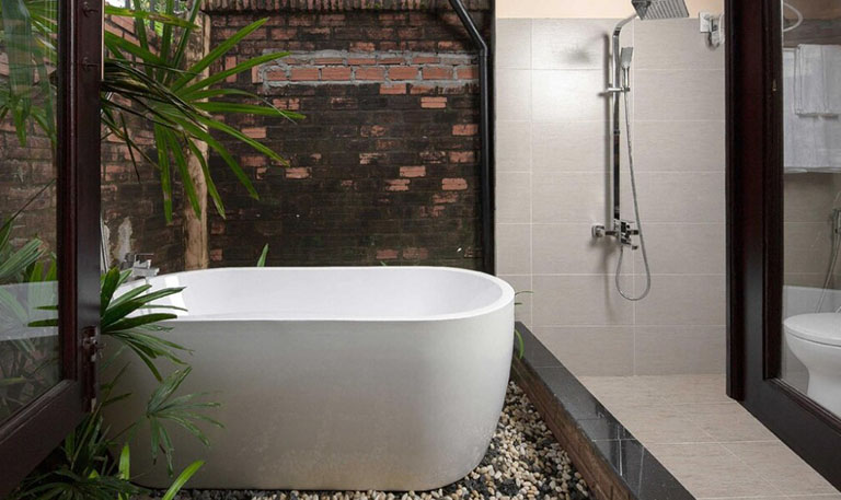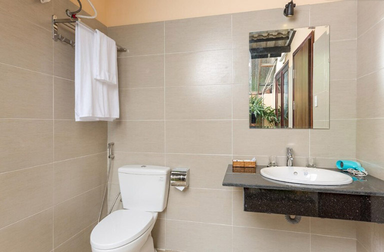 DỊCH: Nhà tắm có cảm giác như một nửa ở ngoài trời, vì vậy muỗi và côn trùng có thể vào bên trong, nhưng bên ngoài có những con bướm bay lượn, tôi thấy điều đó mang lại cảm giác gần gũi với thiên nhiên. Không có nhà hàng xung quanh, và khách sạn cũng không có nhà hàng, nên vấn đề thực phẩm là một điều khiến tôi phải suy nghĩ. Có một cửa hàng nhỏ bên cạnh, nơi có thể mua nước, bia và đồ ăn vặt. Siêu thị nhỏ với biển báo màu xanh mà tôi định đến trong suốt thời gian lưu trú đều không mở cửa. Tôi không có đủ can đảm để lái xe máy, vì vậy tôi đã sử dụng grab hoặc vinbus, nhưng bến xe buýt chính là khoảng đi bộ mất 15 phút. Ở khu vực đó có một số nhà hàng. Nhân viên khách sạn rất thân thiện, vì vậy tôi khuyên mọi người nên đến đây.