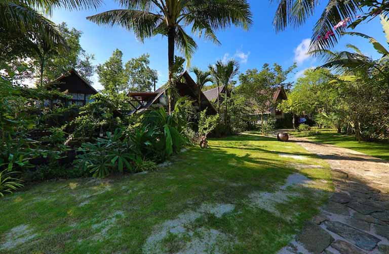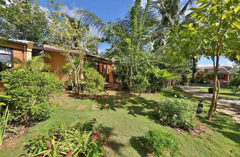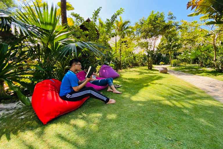 Điểm nhấn đầu tiên phải kể đến là khu vườn xanh tươi được chăm sóc tỉ mỉ. Đây không chỉ là một không gian cây xanh đơn thuần, mà còn là một ốc đảo lý tưởng để bạn trốn khỏi sự ồn ào, hít thở bầu không khí trong lành và tận hưởng trọn vẹn vẻ đẹp của thiên nhiên nhiệt đới. Du khách có thể thong thả dạo bước, tìm một góc yên tĩnh để đọc sách, hoặc đơn giản là ngồi lặng ngắm nhìn.