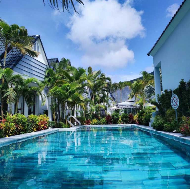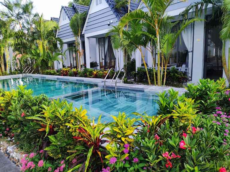 Bên cạnh những bungalow riêng tư, Ngoc Trai Xanh Bungalow còn sở hữu một khu vực hồ bơi và vườn cây xanh mát, tạo nên một ốc đảo thư giãn thực sự. Nằm ngay giữa lòng khu vườn nhiệt đới, hồ bơi ngoài trời được thiết kế hài hòa, như một dòng suối uốn lượn mềm mại, mời gọi bạn đắm mình trong làn nước mát lạnh. Sau một ngày dài khám phá đảo ngọc, còn gì tuyệt vời hơn khi được thả mình vào làn nước trong xanh, ngước nhìn bầu trời trong vắt và cảm nhận sự bình yên tuyệt đối. Khu vực quanh hồ bơi được bố trí nhiều ghế nằm thoải mái, là nơi lý tưởng để bạn phơi nắng, đọc sách hoặc đơn giản chỉ là nhắm mắt lại và lắng nghe tiếng chim hót líu lo.