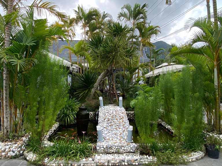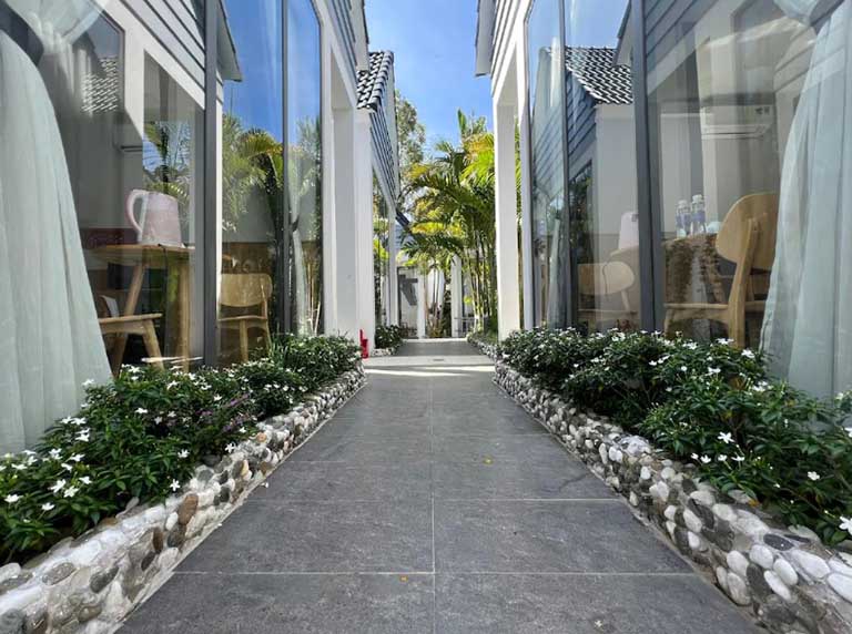 Xung quanh hồ bơi là một khu vườn tự nhiên được chăm sóc tỉ mỉ, nơi mỗi lối đi đều là một cuộc dạo chơi đầy khám phá. Từng bụi cây, khóm hoa đều được sắp đặt khéo léo, tạo nên một bức tranh thiên nhiên sống động, ngập tràn sắc màu và hương thơm. Ánh nắng len lỏi qua từng tán lá, vẽ nên những vệt sáng lấp lánh trên mặt đất, mang đến cảm giác thư thái và gần gũi. Tại đây, bạn có thể tản bộ, hít thở không khí trong lành, hoặc tìm một góc nhỏ yên tĩnh để ngồi thiền và kết nối với thiên nhiên.