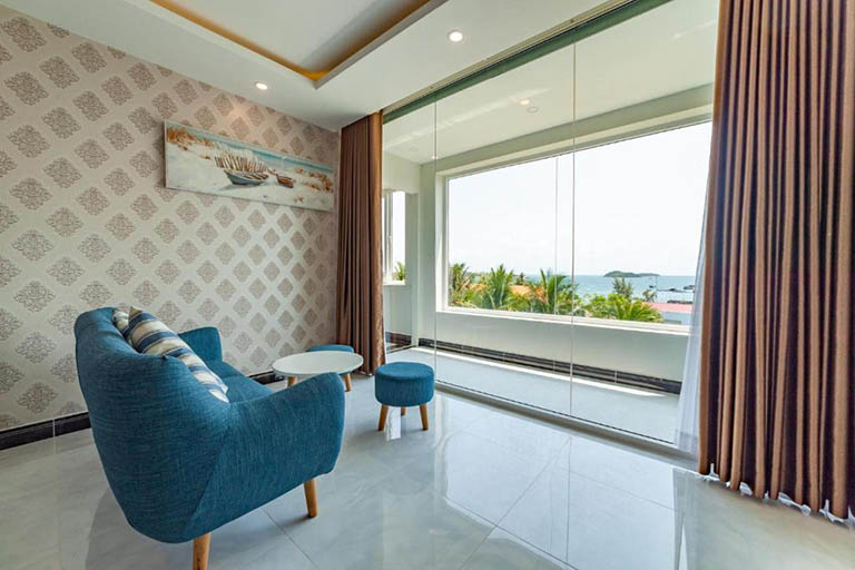 Bước vào PH Suite 45m2, bạn sẽ được đắm chìm trong một không gian kiến trúc đầy tinh tế. Phòng khách và phòng ngủ được ngăn cách khéo léo, tạo nên sự riêng tư tuyệt đối. Trong phòng khách, quầy bar duyên dáng và bộ sofa ấm cúng sẽ mang đến những khoảnh khắc thư giãn đáng nhớ. Đặc biệt, từ phòng ngủ, bạn có thể chiêm ngưỡng vẻ đẹp không ngừng nghỉ của biển cả. PH Suite không chỉ là một căn phòng, mà còn là điểm đến cho những ai tìm kiếm sự lãng mạn và đẳng cấp.