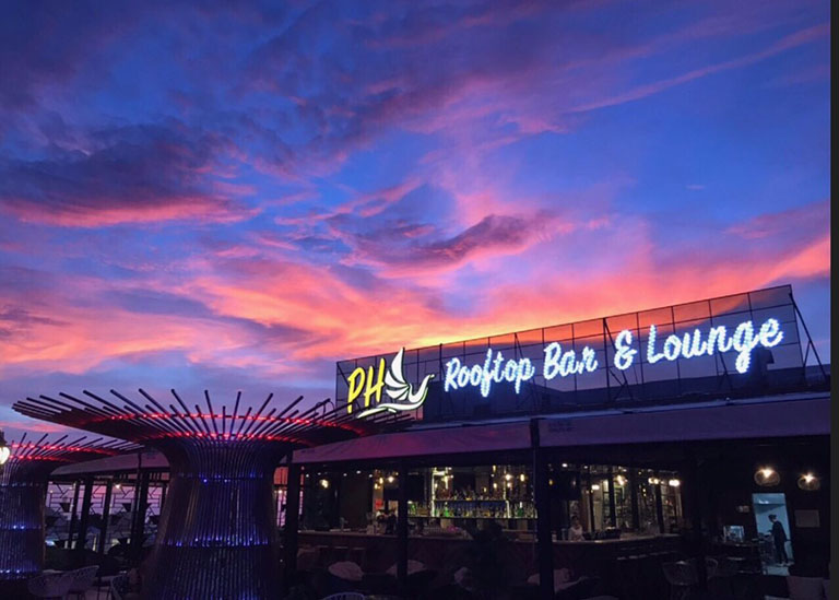 Với phong cách trang trí hiện đại, PH Rooftop Bar & Lounge mang đến sự kết hợp hoàn hảo giữa vẻ đẹp tinh tế của kiến trúc và sự lãng mạn của thiên nhiên. Từ đây, bạn có thể chiêm ngưỡng khung cảnh hoàng hôn rực rỡ trên biển, hít thở làn gió trong lành và tận hưởng không gian thoáng đãng.