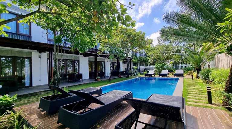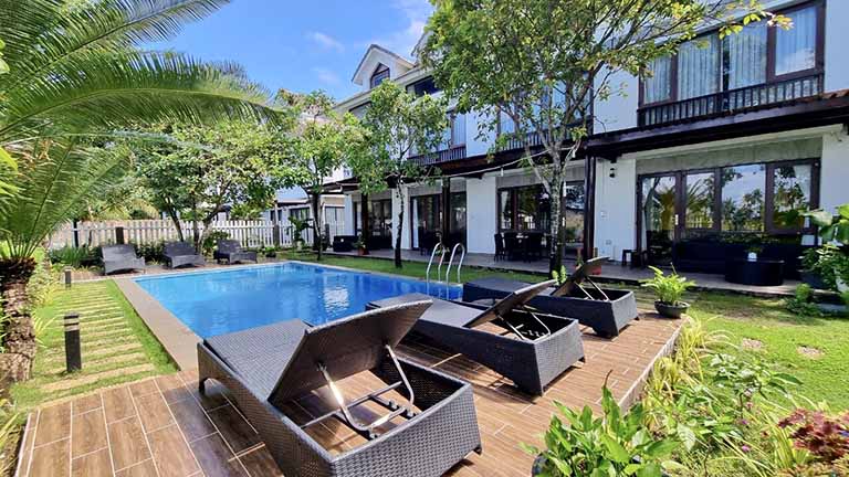 Biệt thự 5 phòng ngủ, khuôn viên có hồ bơi chung cho tất cả các biệt thự, phù hợp cho nhóm 10 khách.